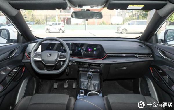 接下来我们再来欣赏内饰设计,不同车型版本所搭载的配置有所不同,因此中控台布局也略微有所区别,不过即便是入门级车型,也搭载了10.25英寸中控屏和彩色行车电脑显示屏,两块屏幕连接处带有一定夹角,虽说看起来不够高级,但参考它的售价之后好像没什么好挑剔的。不过低配版本的科技配置确实有些欠缺,从中高配车型开始才支持语音识别、车联网、OTA升级、手机APP控制等常规智能化配置,进一步提升用车便利性。